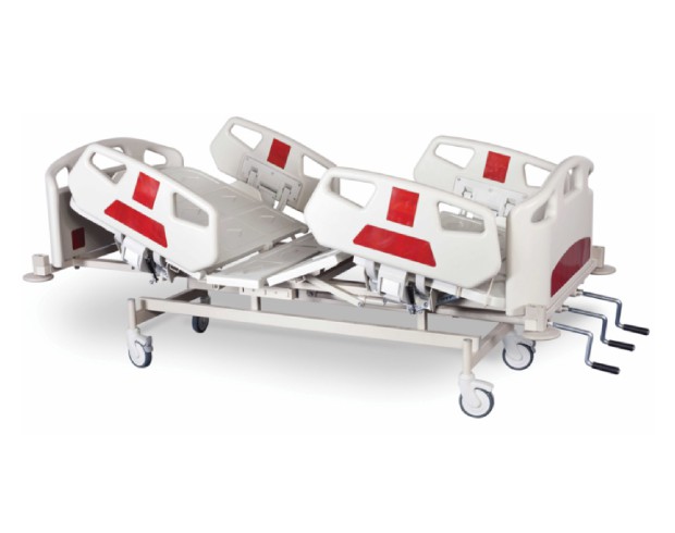 Back and leg movements, height adjustment, back-leg movement (vascular), and knee bending are controlled by three manual cranks.