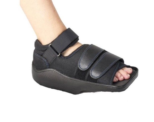 Manufactured of rubber on slip base portion and leather on the upper surface. Helps with post-op early mobilization. Effective in reducing edema in the feet and accelerating the healing process. Long Velcro allows the personalized use of the desired width and tightness. Inclination of the sole provides full arch support and is effective on reducing the load on the foreleg