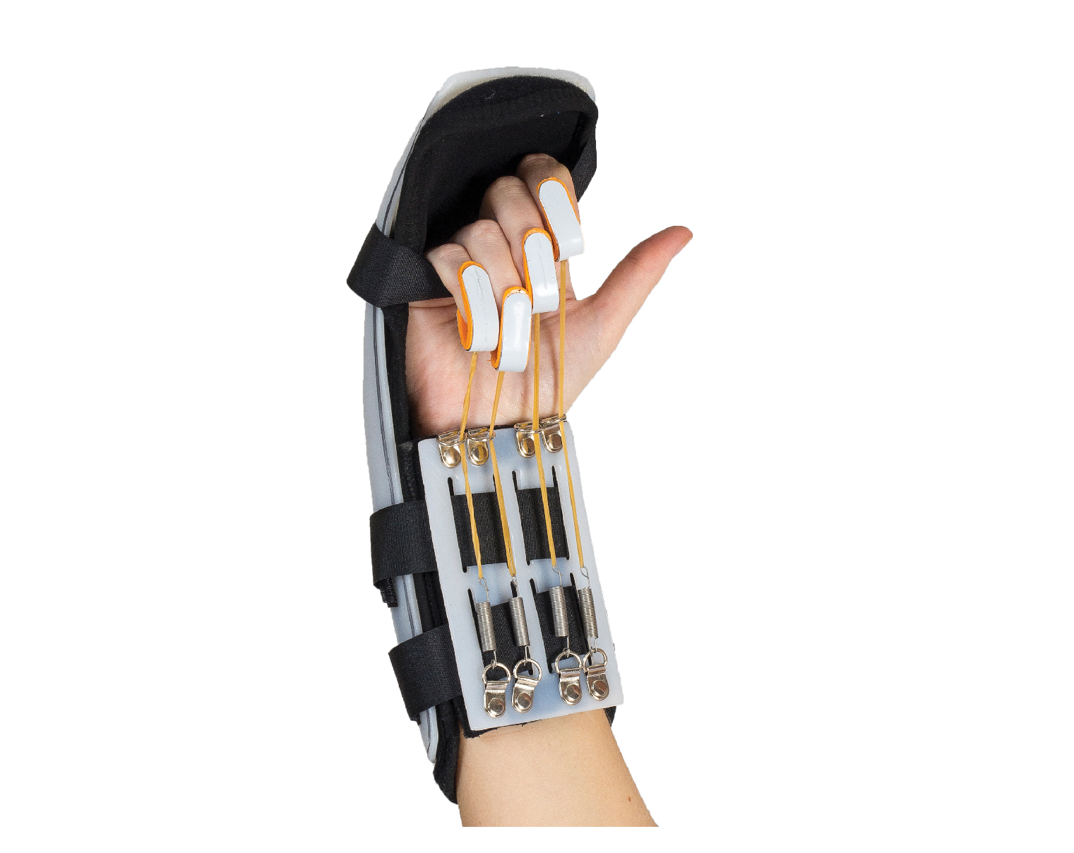 .Made of thermoplastic covered by terry fabric from the inside.Pulls down the fingers and let them move a bit to help training them
